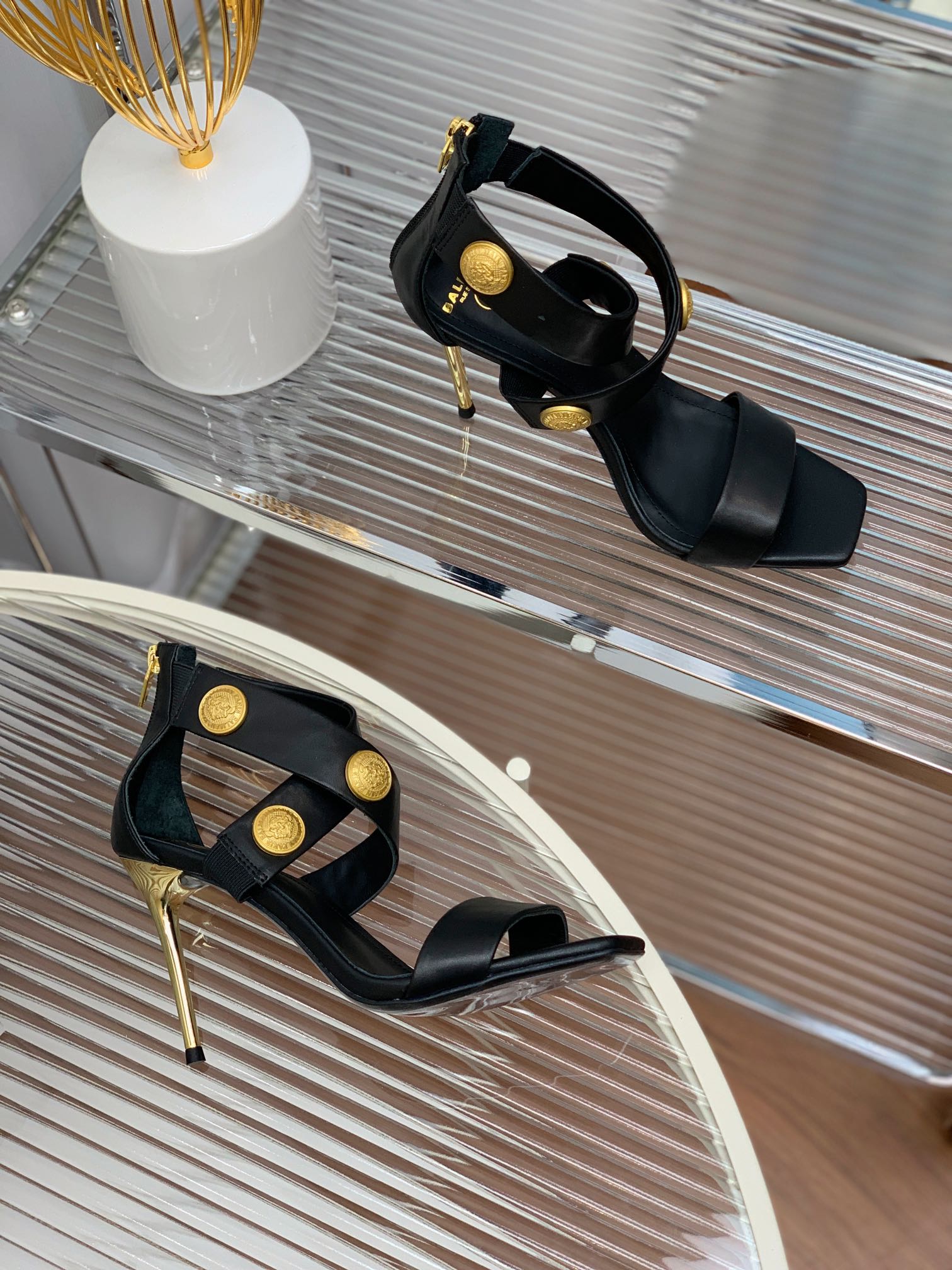 BALMAIN 25S CROSSOVER STRAP HIGH HEELS 95MM IN BLACK CALFSKIN