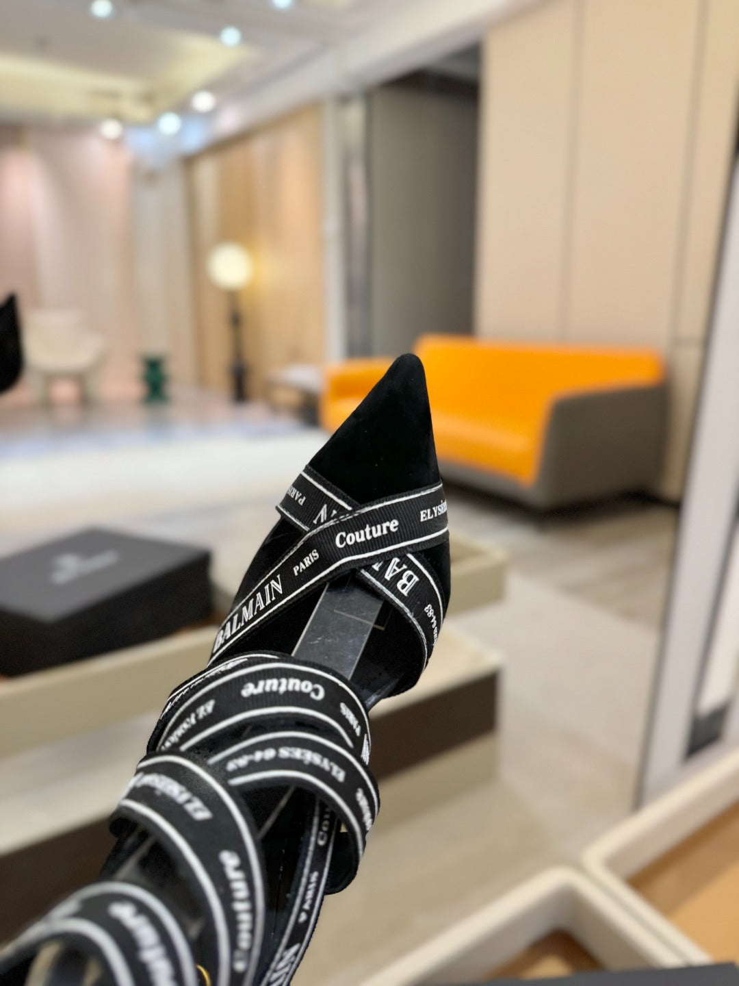 BALMAIN 25S HIGH HEELS LOGO RIBBON 95MM IN BLACK FULL SUEDE