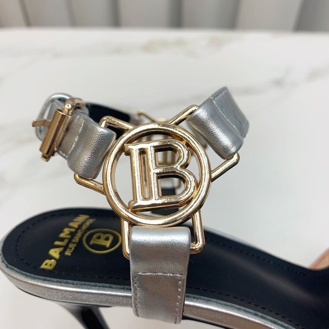 BALMAIN 25S HIGH HEELS WITH B METAL DETAIL 95MM IN SILVER CALFSKIN