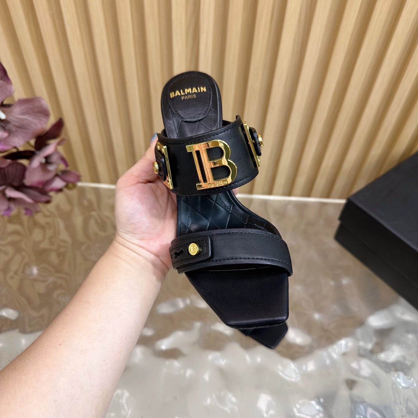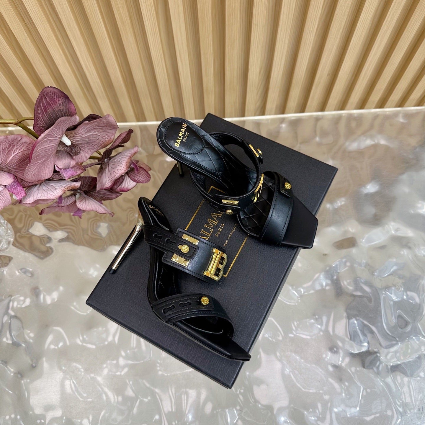 BALMAIN 25S MULES IN STRIPED LEATHER 95MM IN BLACK CALFSKIN GOLD HARDWARE