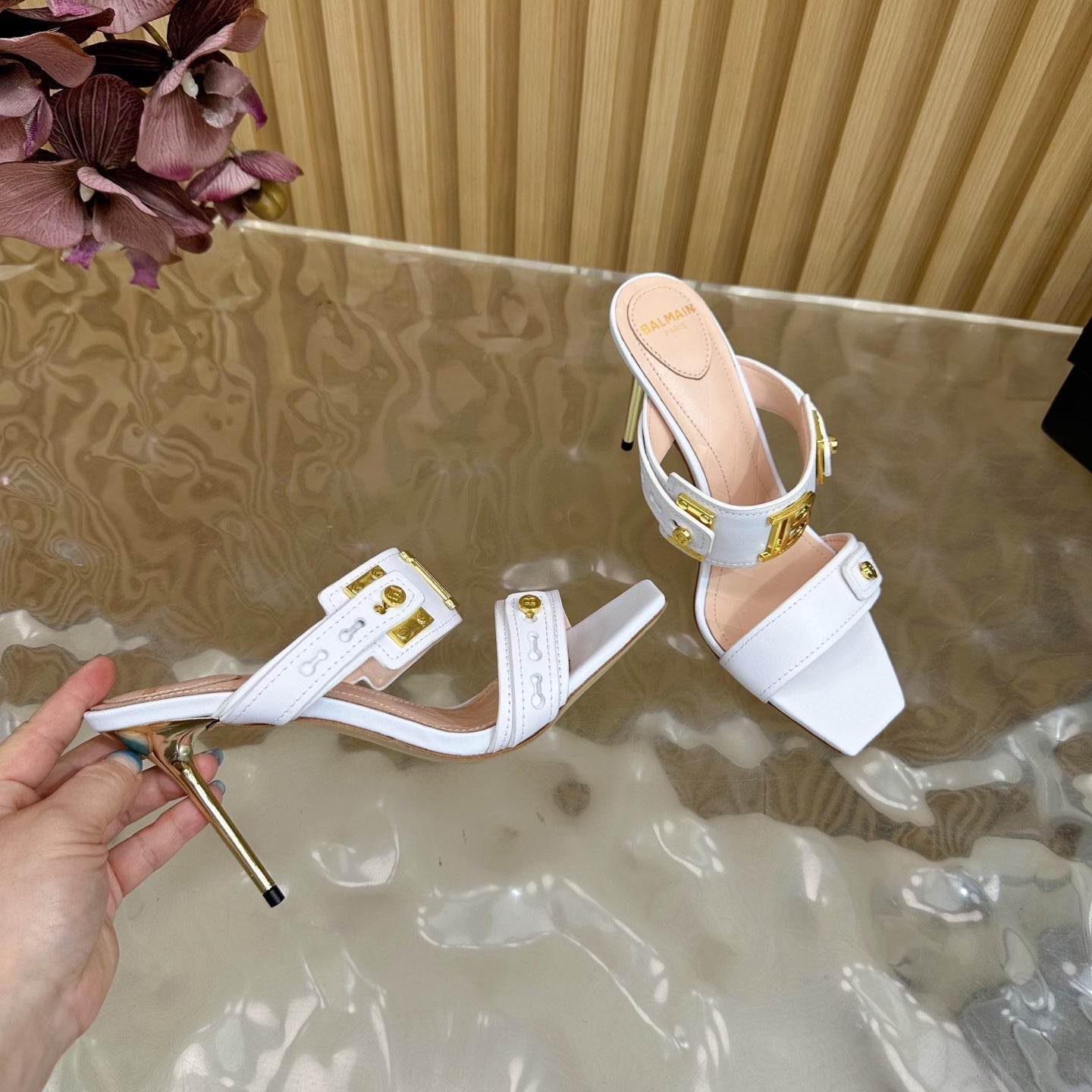BALMAIN 25S MULES IN STRIPED LEATHER 95MM IN WHITE CALFSKIN GOLD HARDWARE