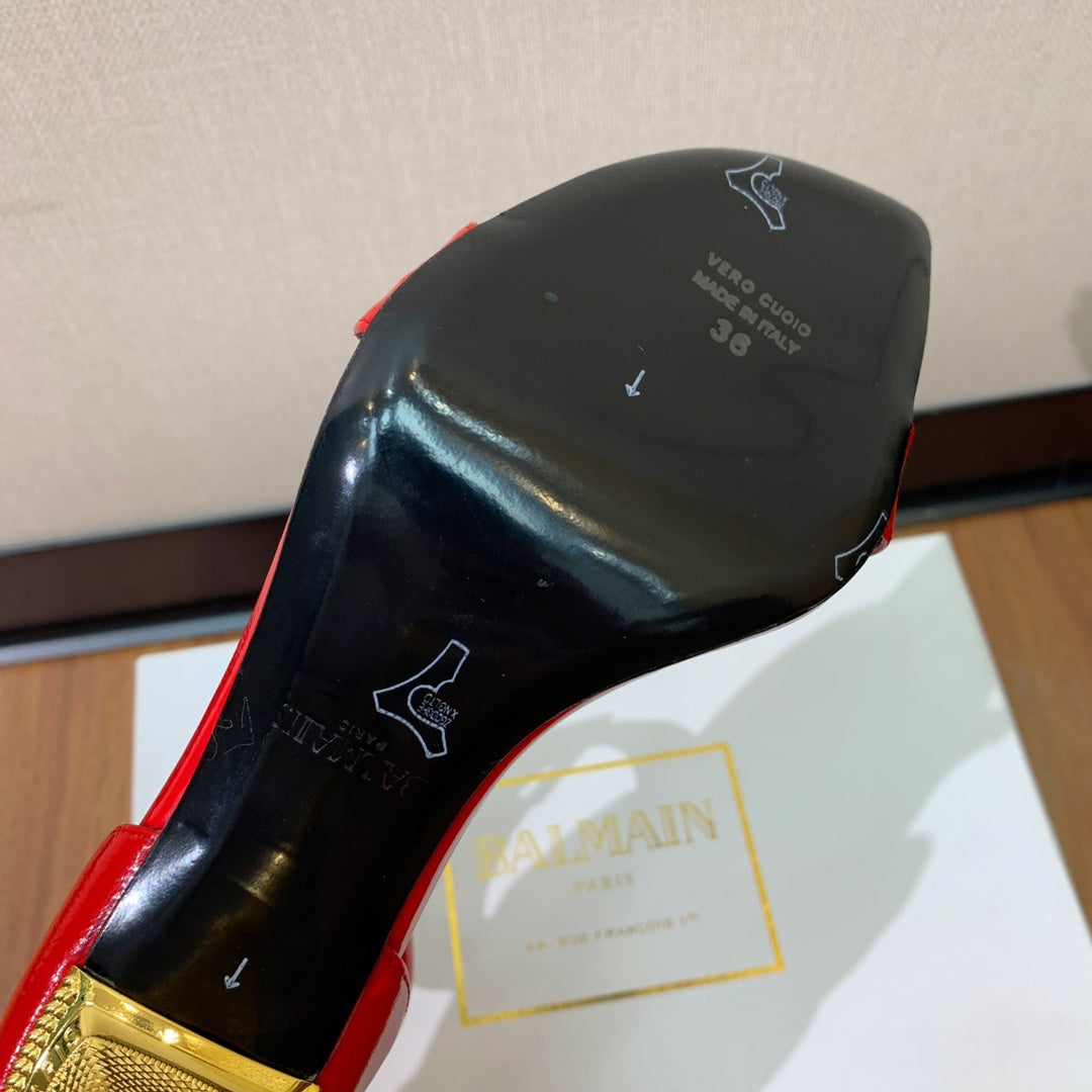 BALMAIN 25S SQUARE STRAP HIGH HEELS 100MM IN RED PATENT CALFSKIN