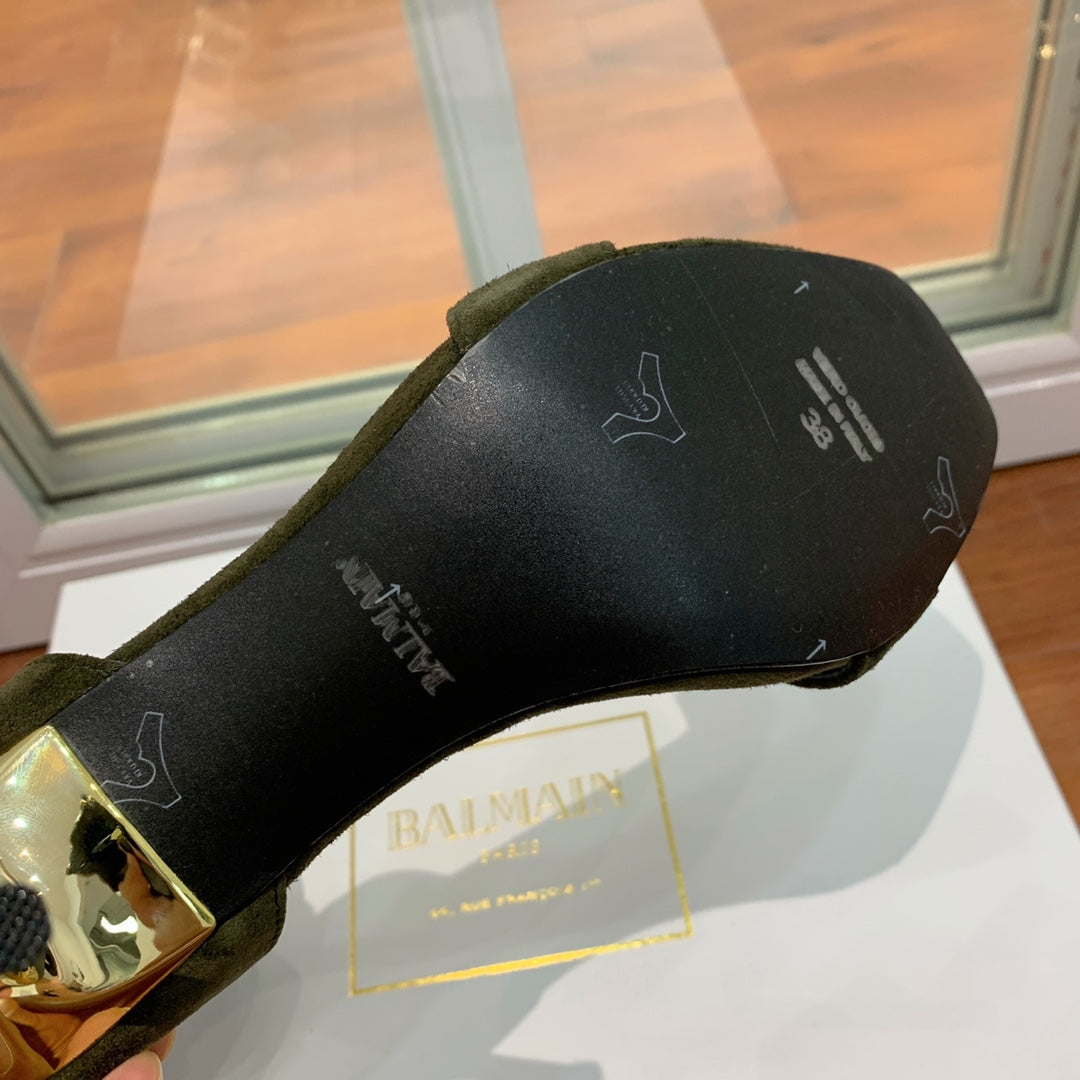 BALMAIN 25S THIN STRAP HIGH HEELS 105MM IN VERY DEEP OLIVE SUEDE GOLD HARDWARE