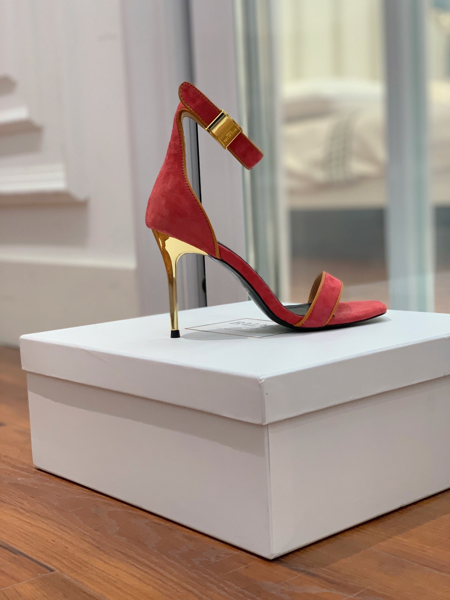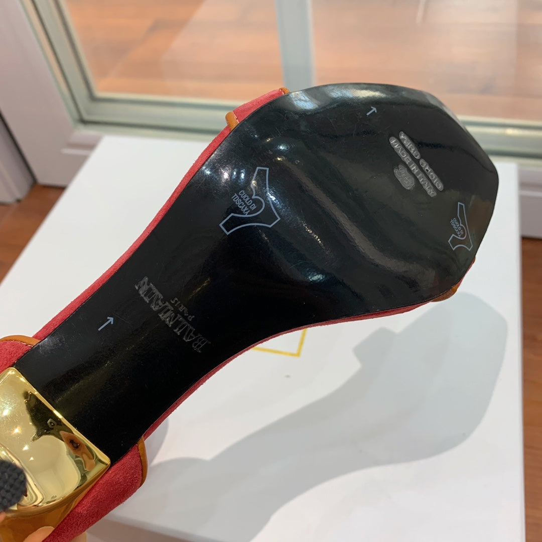 BALMAIN 25S UMA HEELED SANDALS 105MM IN RED SUEDE GOLD HARDWARE