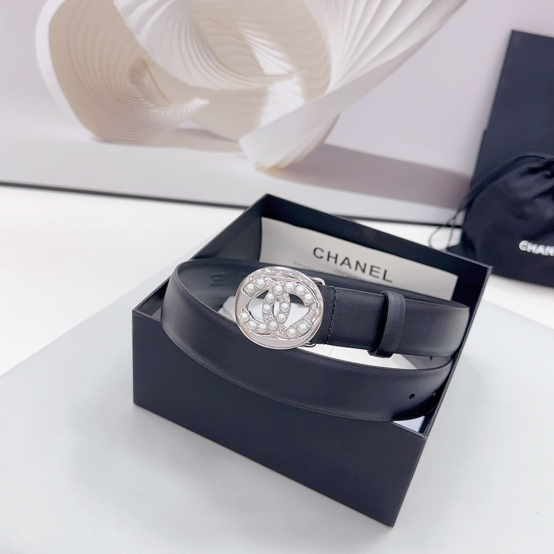 CC 30MM BELT IN BLACK CALFSKIN SILVER HARDWARE ATTACH PEARLS