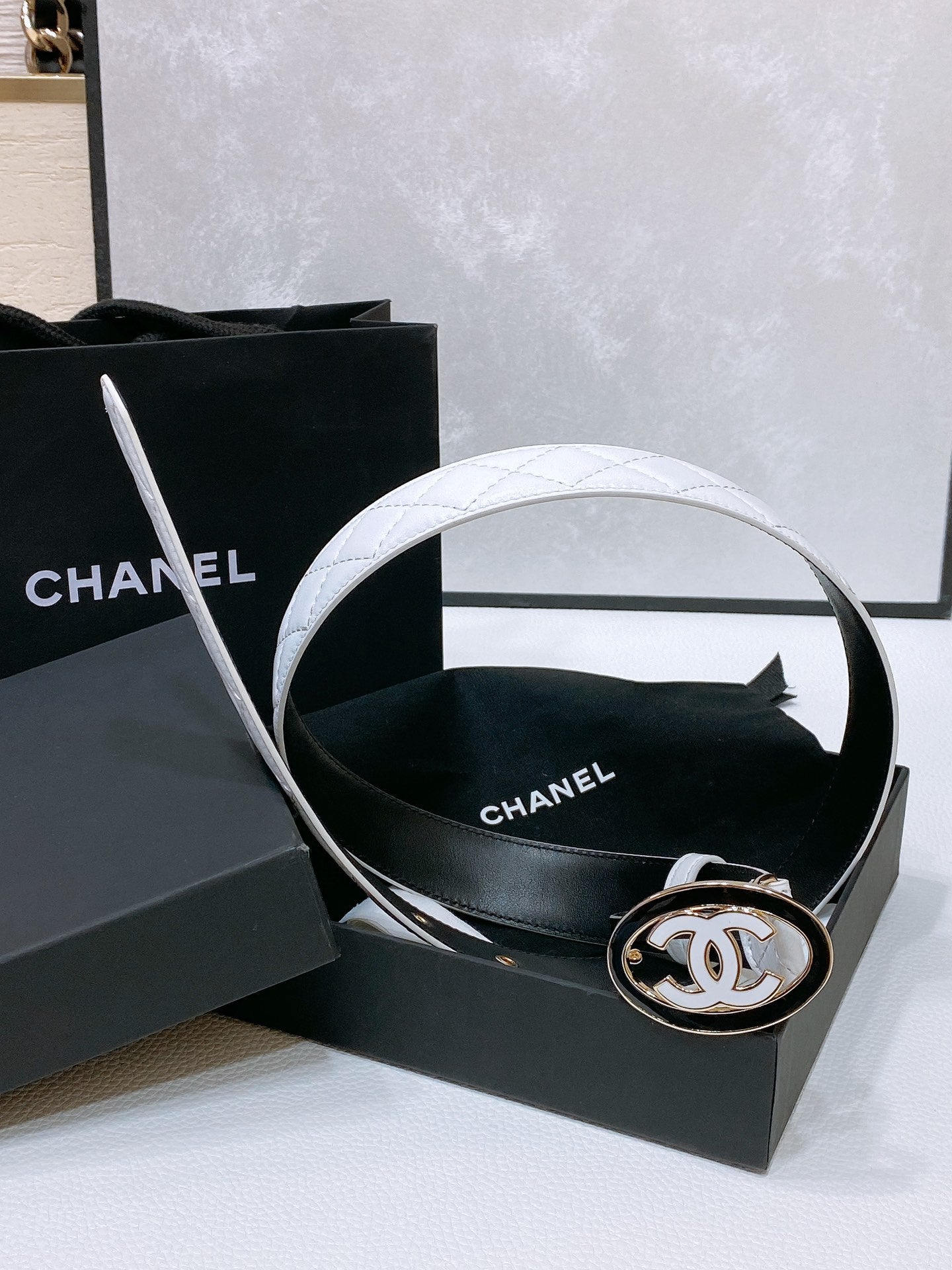 CC 30MM BELT IN WHITE EMBROIDERED CALFSKIN WHITE MIX BLACK METAL LOGO GOLD HARDWARE