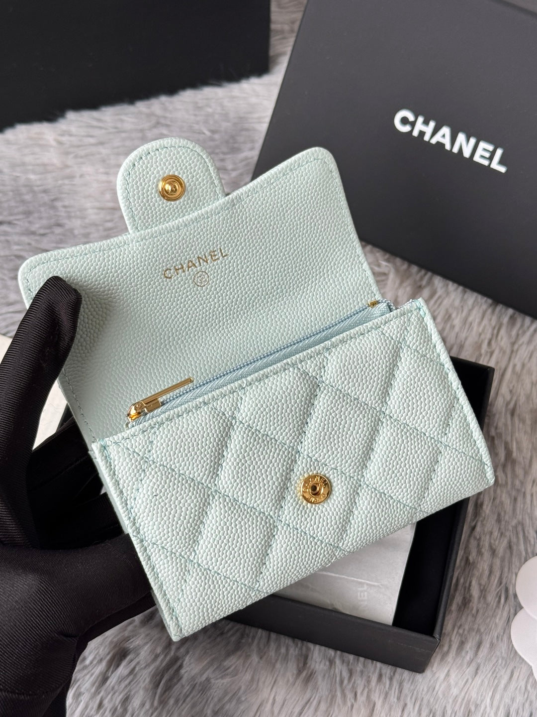 CHANEL 25S CLASSIC FLAP CARD HOLDER 11 IN SOFT MINT CAVIAR GOLD HARDWARE