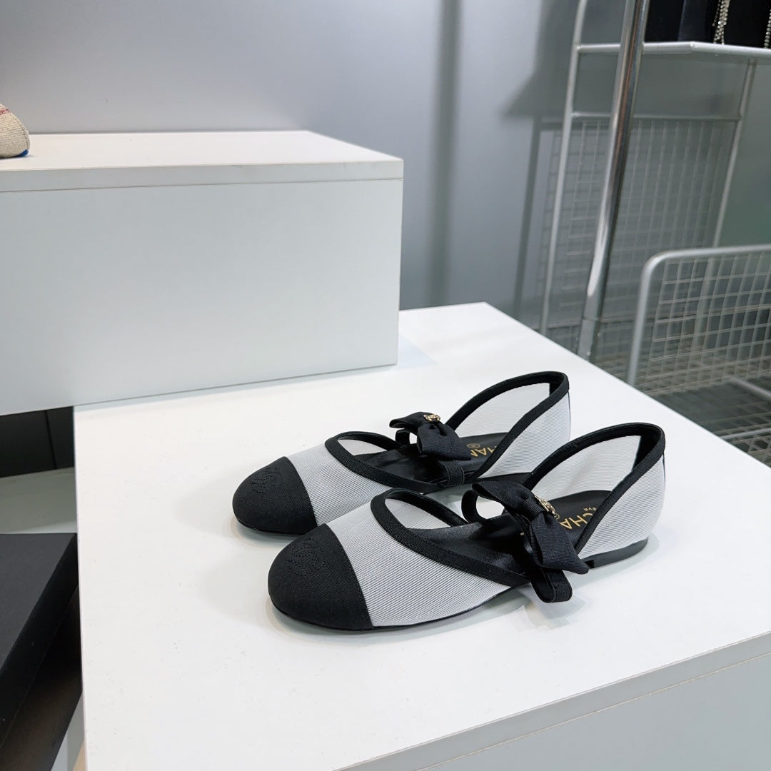 CHANEL FLAT MARY JANE SHOES 25S IN WHITE MIX BLACK MESH FABRIC EMBOSSED LOGO WITH BOW