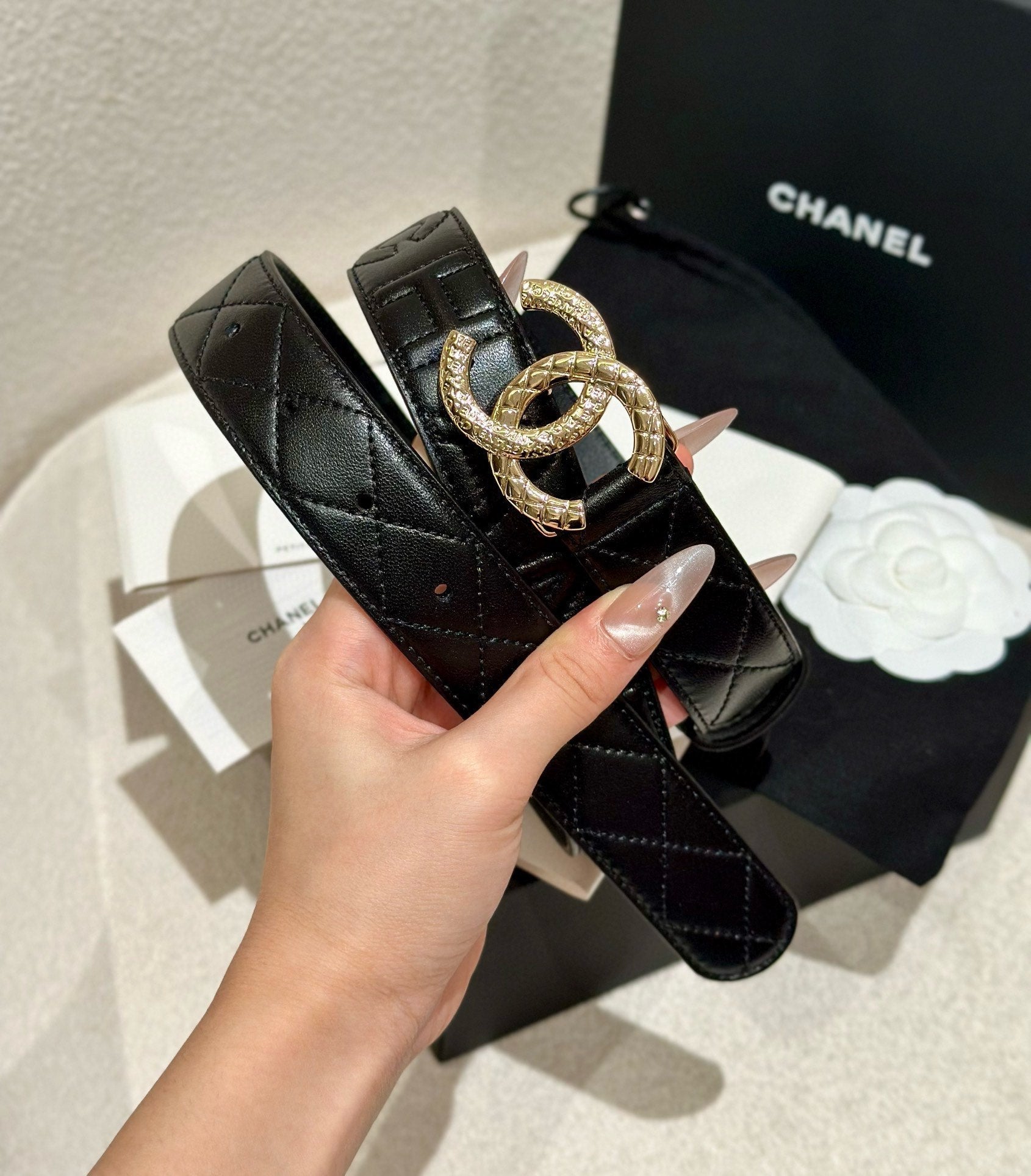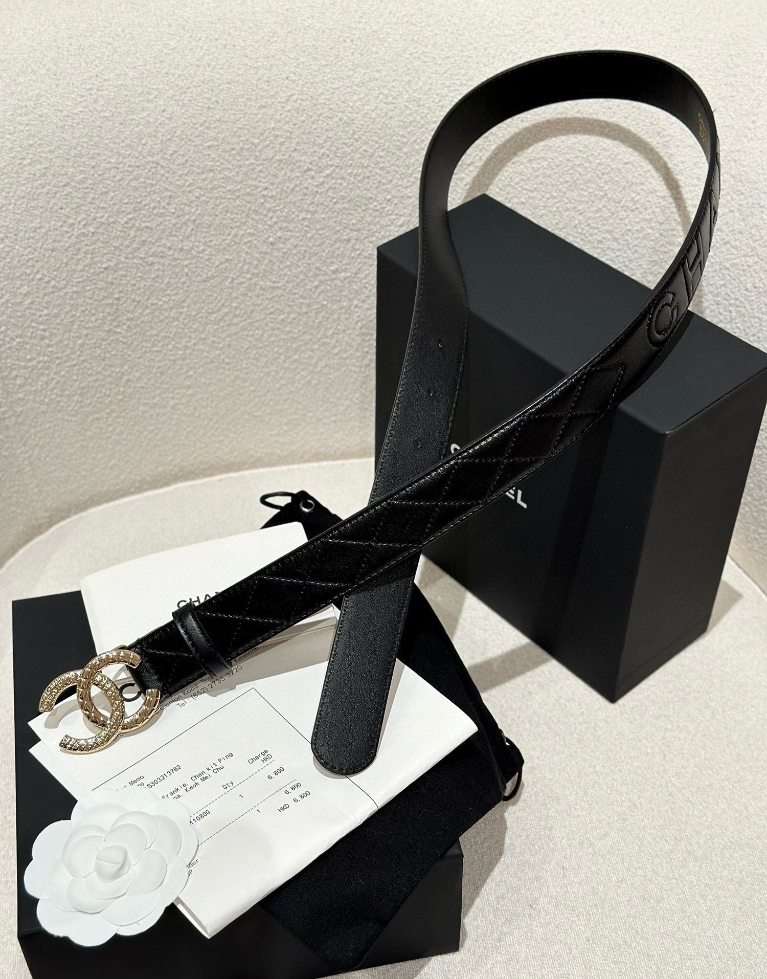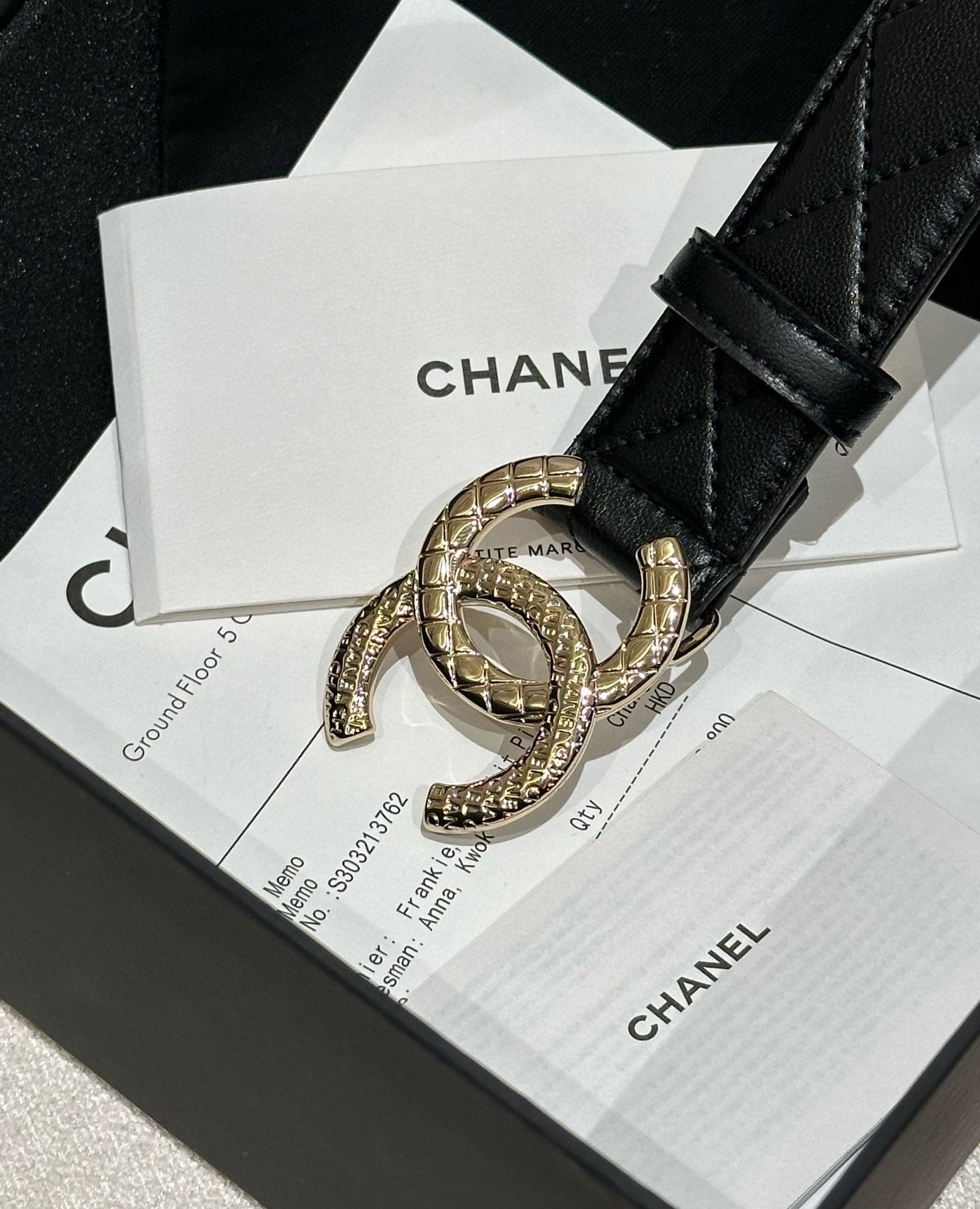 DOUBLE C BELT 30MM IN BLACK CALFSKIN EMBOSSED LOGO GOLD BUCKLE