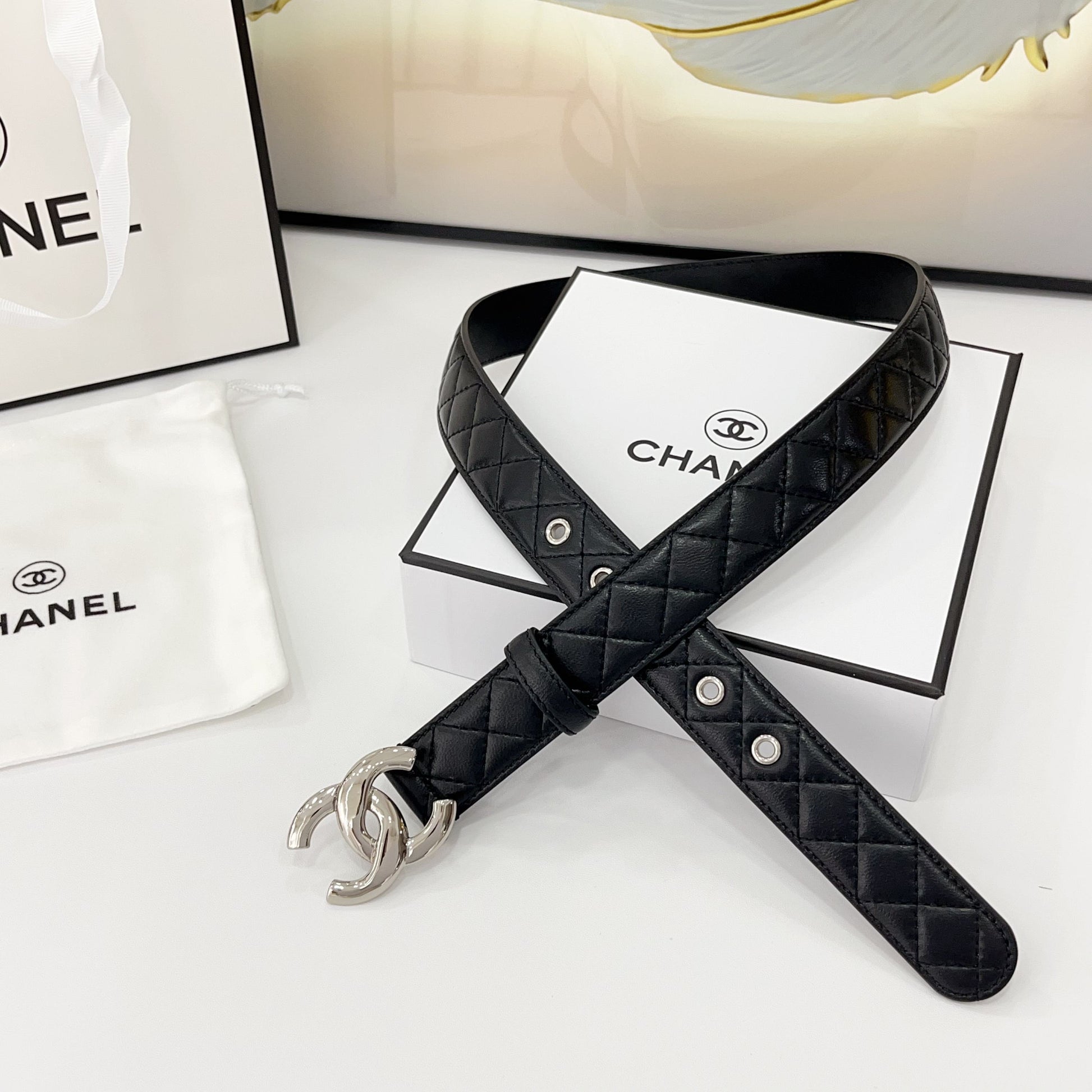 DOUBLE C BELT 30MM IN BLACK QUILTED LEATHER WITH SILVER BUCKLE