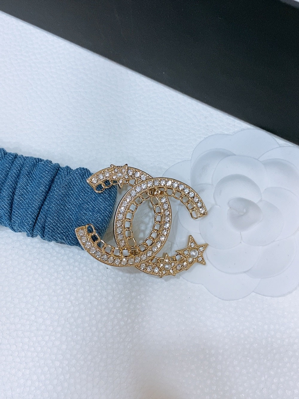 DOUBLE C ELASTIC BELT 30MM IN BLUE DENIM GOLD CRYSTAL STAR EMBELLISHED BUCKLE