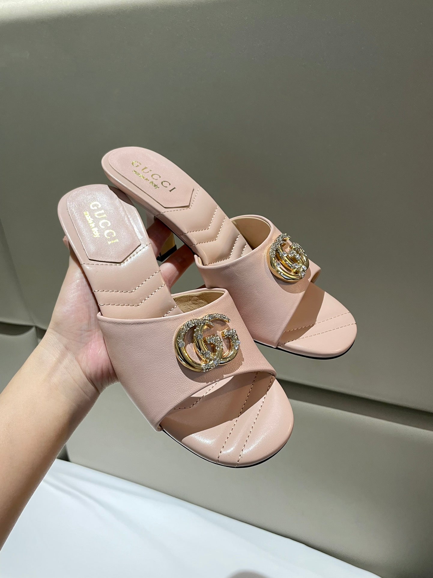 GG HIGH HEELS 70 IN PASTEL PINK LAMBSKIN GOLD HARDWARE WITH CRYSTALS