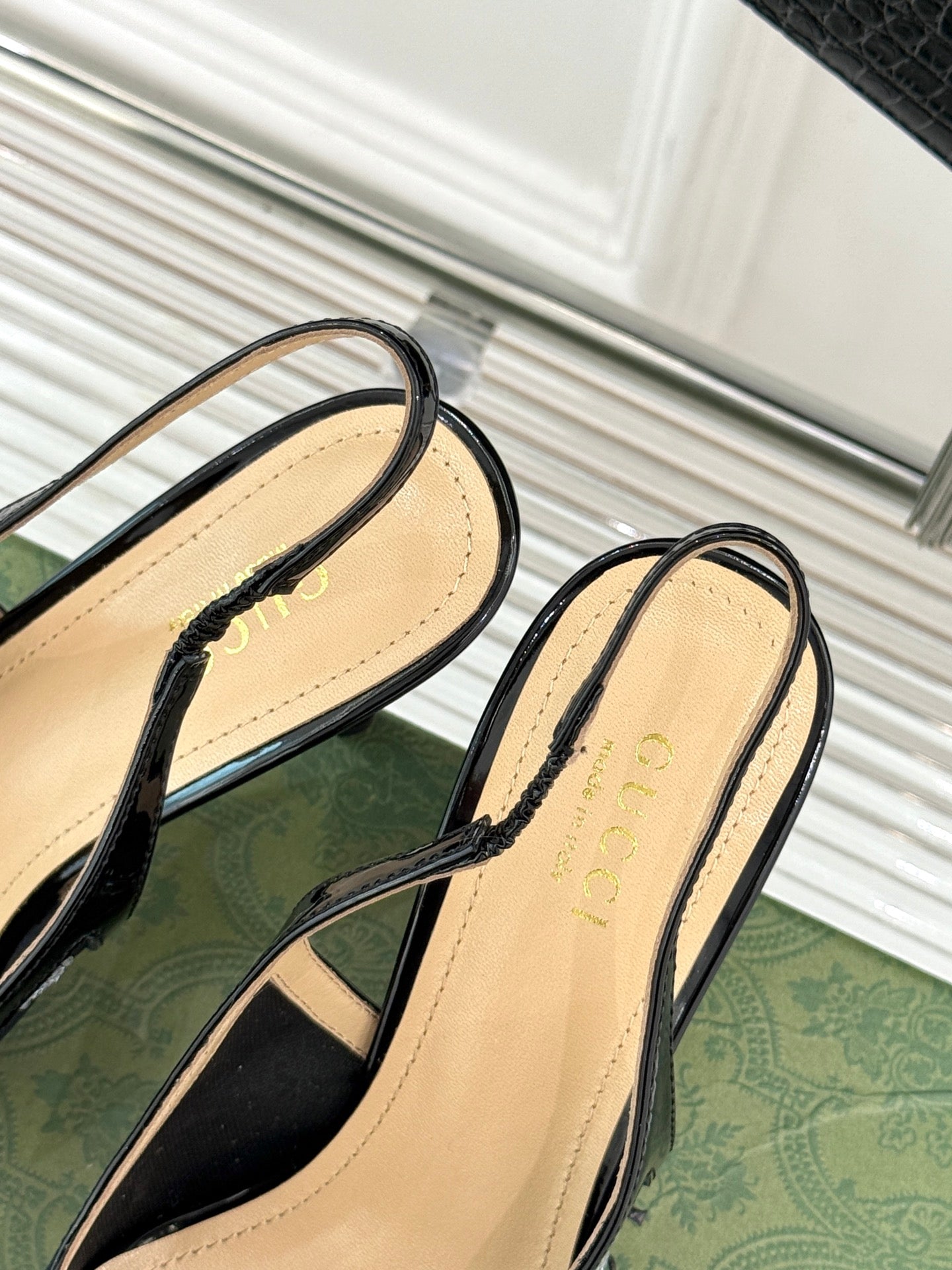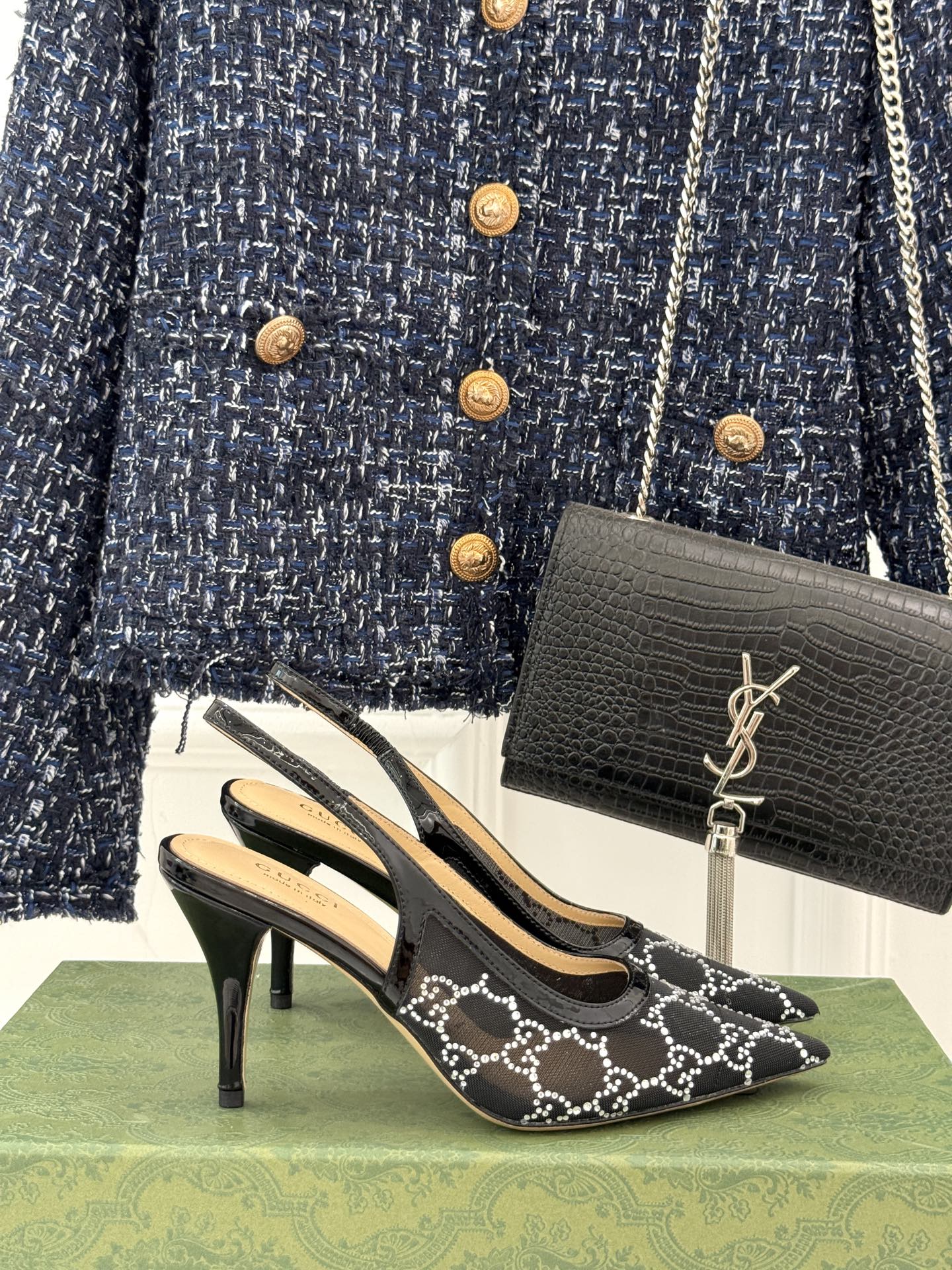 GG HIGH SLINGBACK 8.5 CM IN BLACK CLASSIC POINTED-TOE MESH WITH RHINESTONE EMBELLISHMENTS