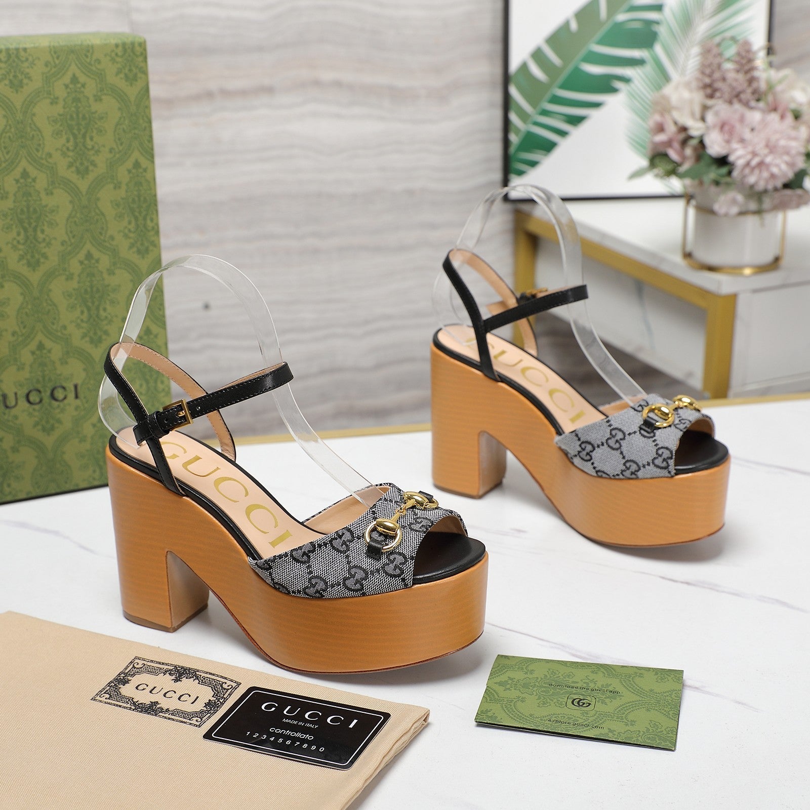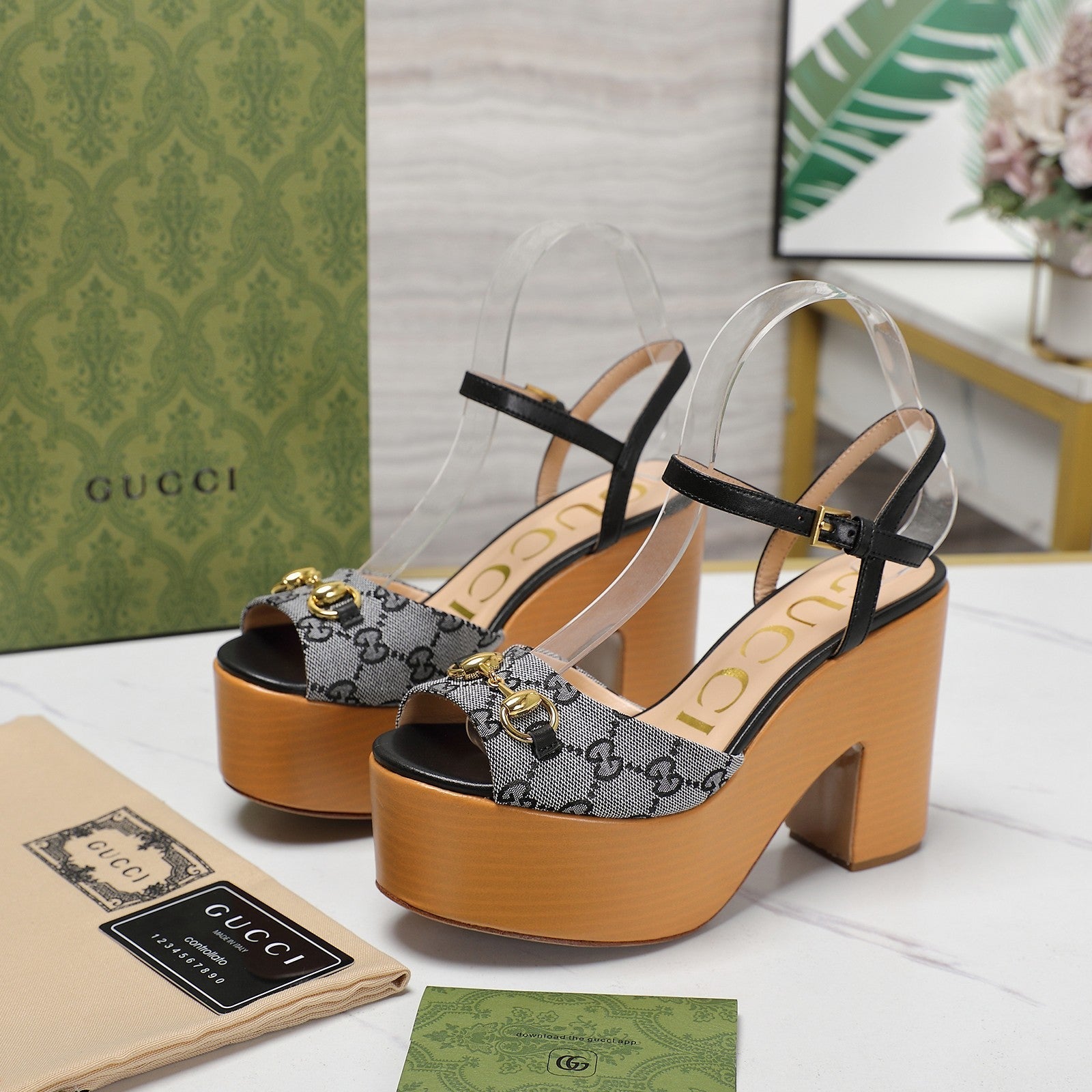 GG HORSEBIT WEDGE SANDAL IN BLACK MONOGRAM JACQUARD FABRIC AND SHEEPSKIN LINING
