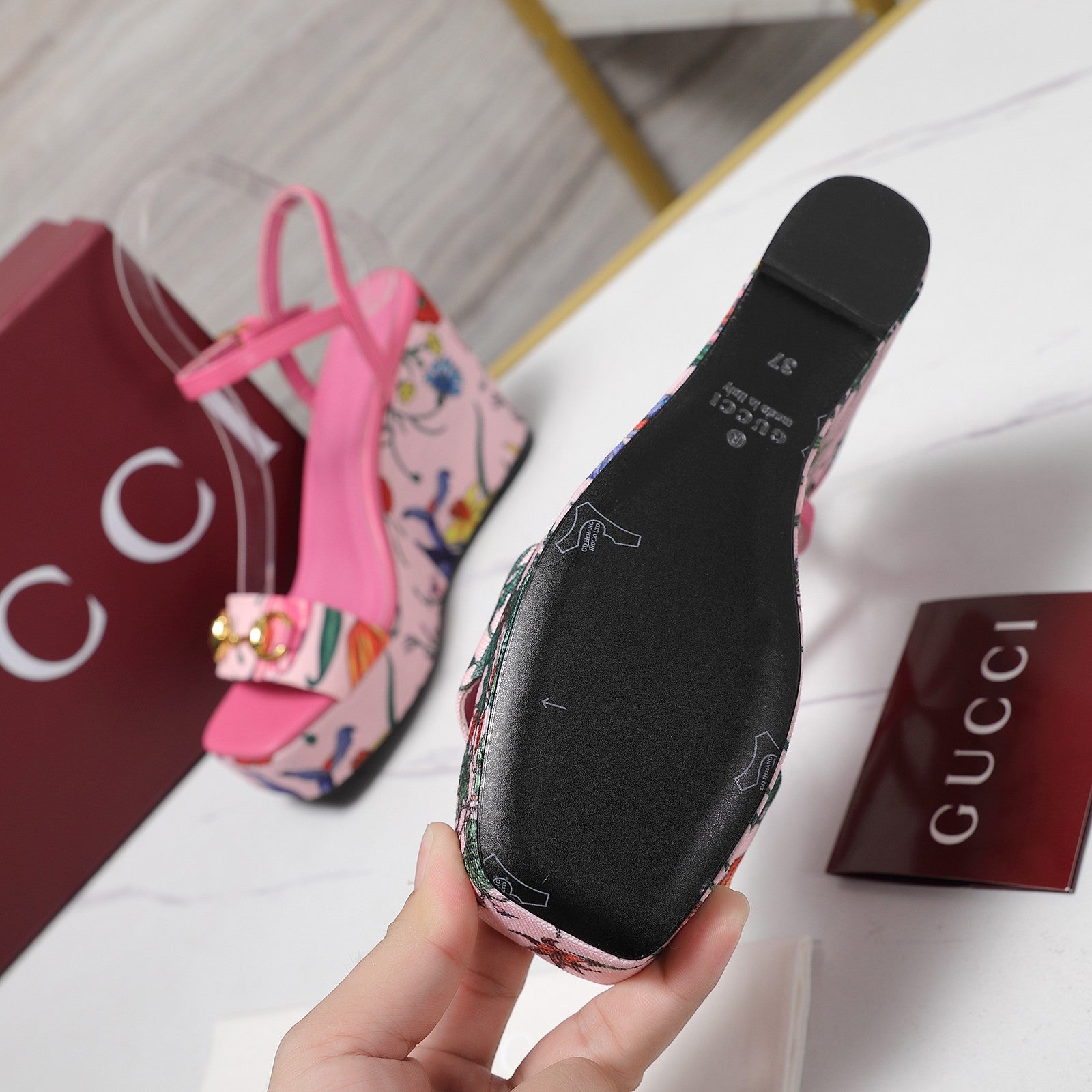 GG WEDGE HEEL SANDALS 100 IN PINK FABRIC FLORAL PRINT