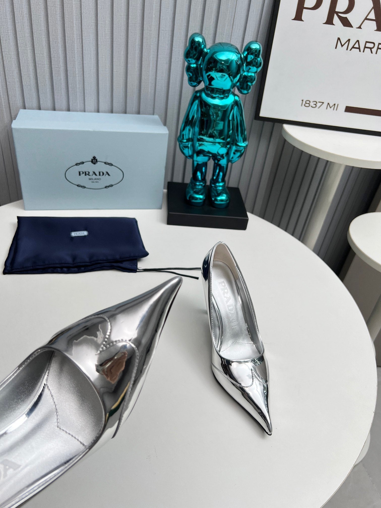 HIGH POINTED-TOE PUMPS IN SILVER GLOSSY CALFSKIN