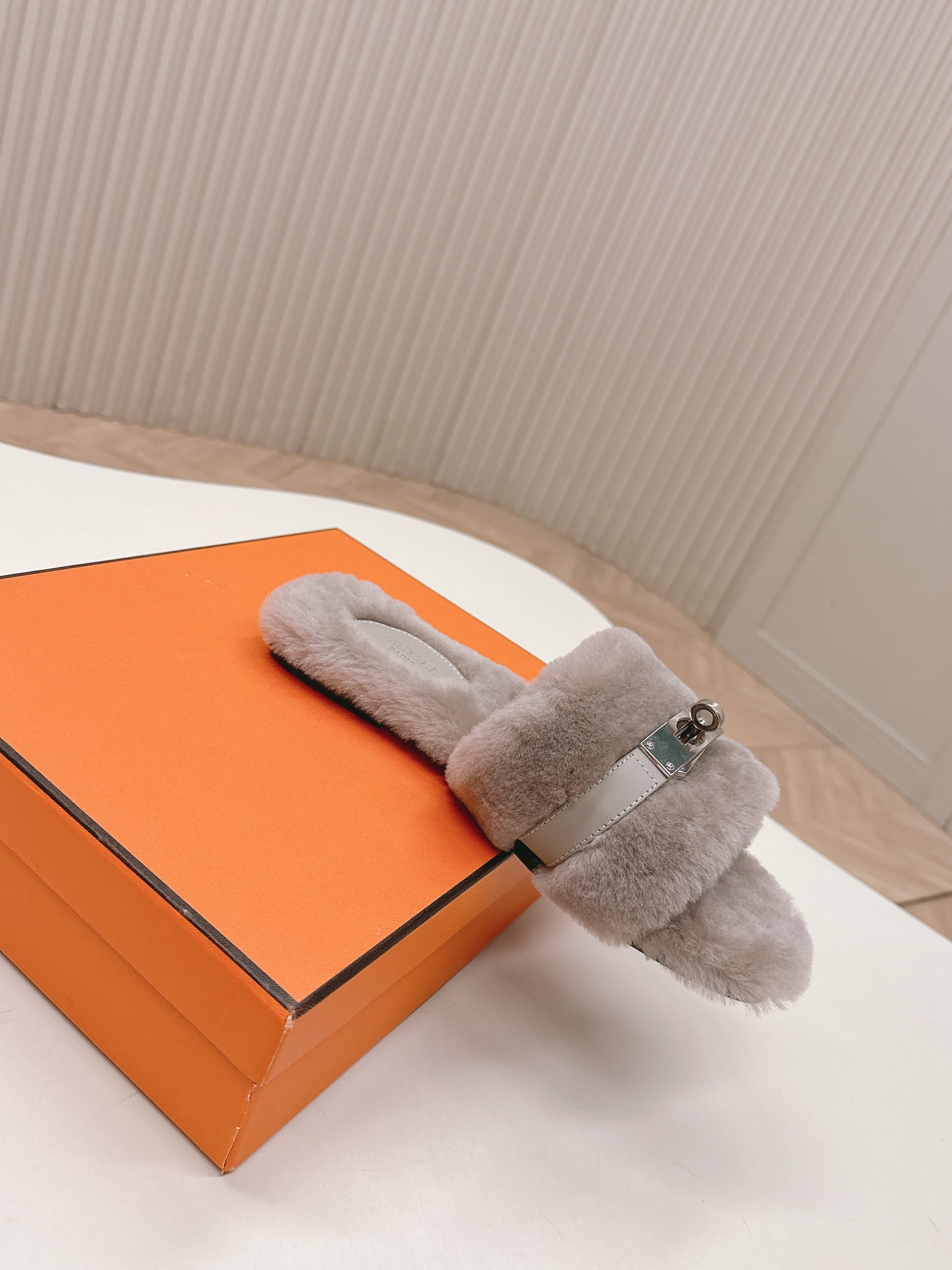 HM 25S ORAN SANDAL IN PALE BEIGE GRAY SHEARLING WITH SILVER HARDWARE