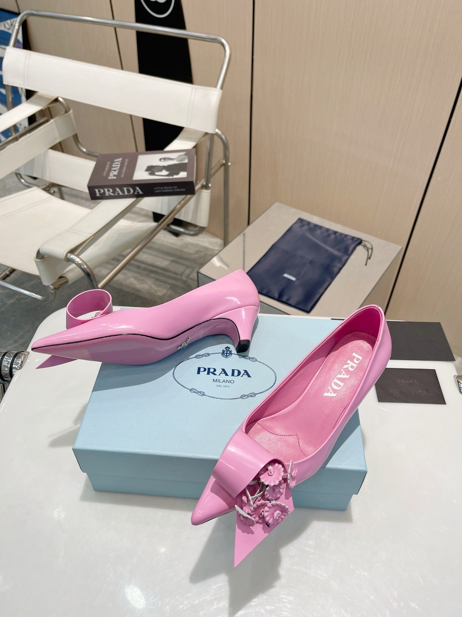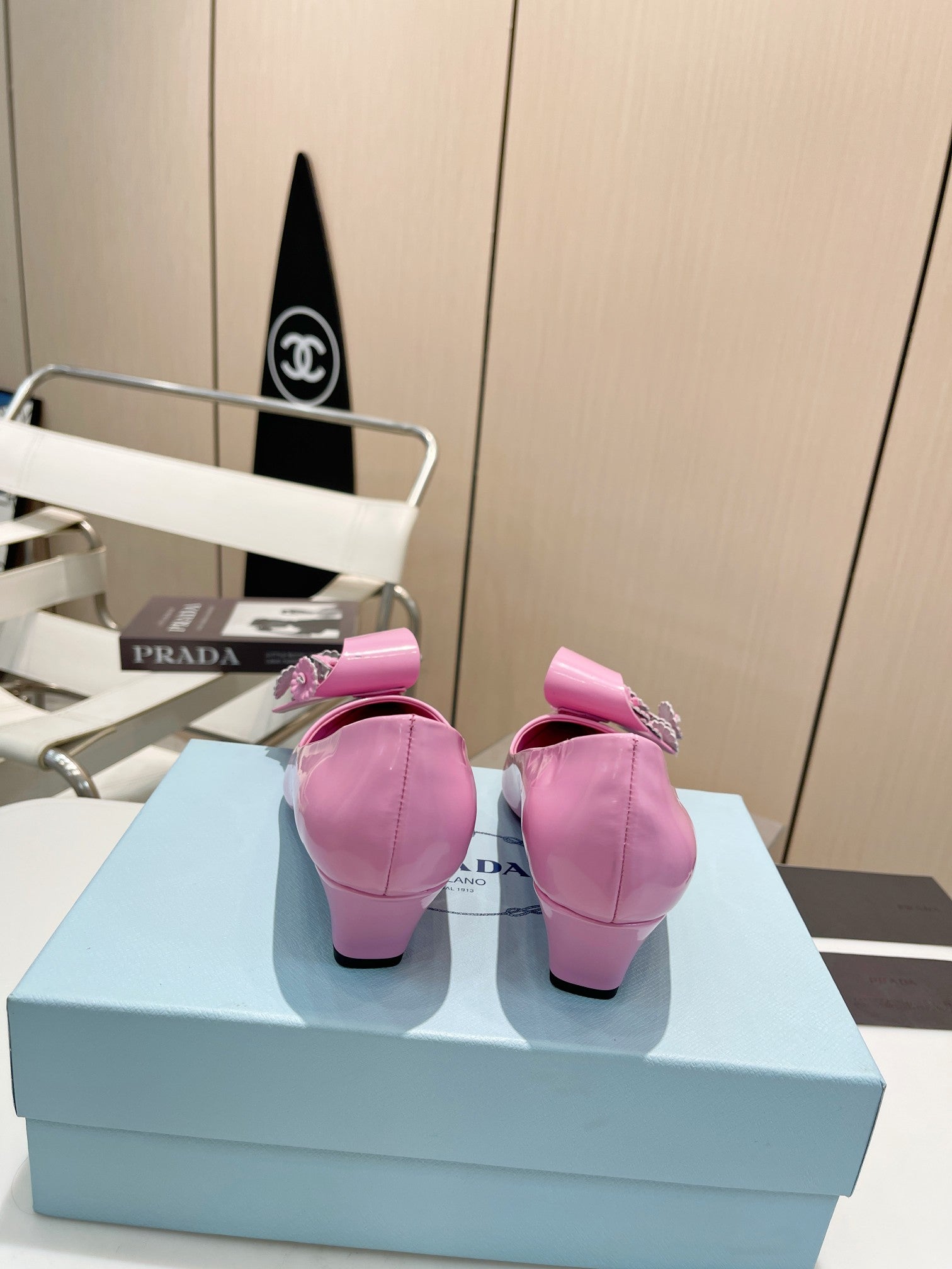 MEDIUM HEEL PUMPS IN PINK PATENT CALFSKIN ATTACHED CREATIVE FLOWERS
