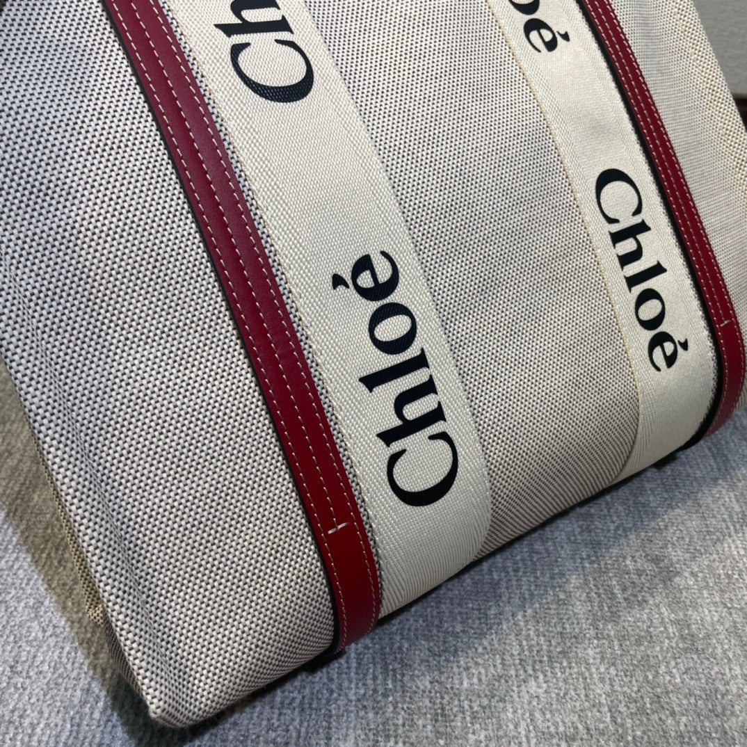 MEDIUM STRAP WOODY TOTE BAG 37 IN BEIGE LINEN CANVAS BLACK WEBBING LOGO EMBROIDER RED CALFSKIN