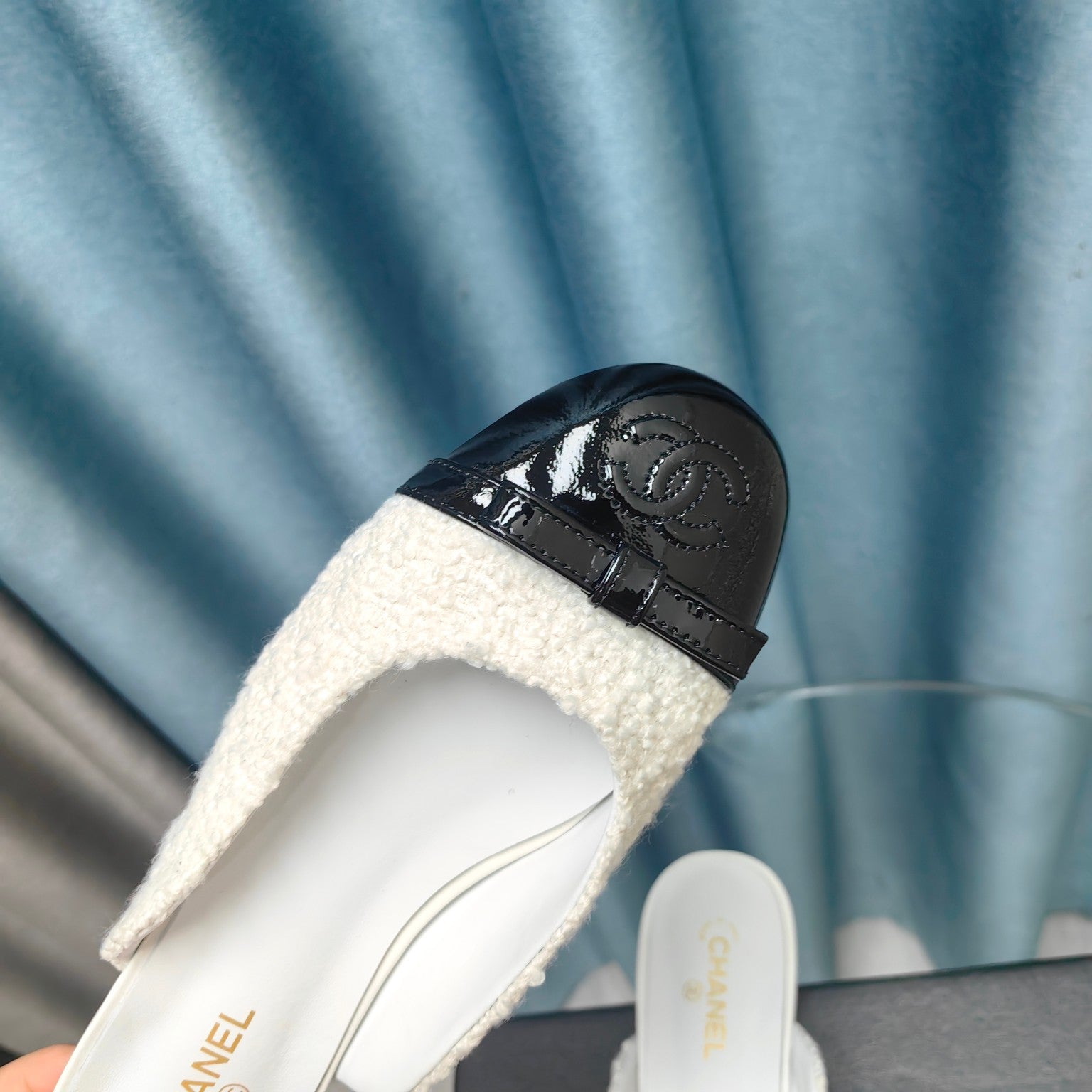 MULE IN WHITE TWEED AND BLACK LAMBSKIN