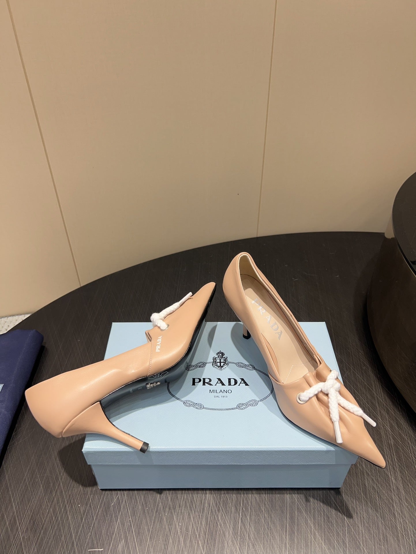 PRADA 25S POINTED TOE HIGH HEELS 85MM IN BEIGE LAMBSKIN WITH TIE UP DESIGN