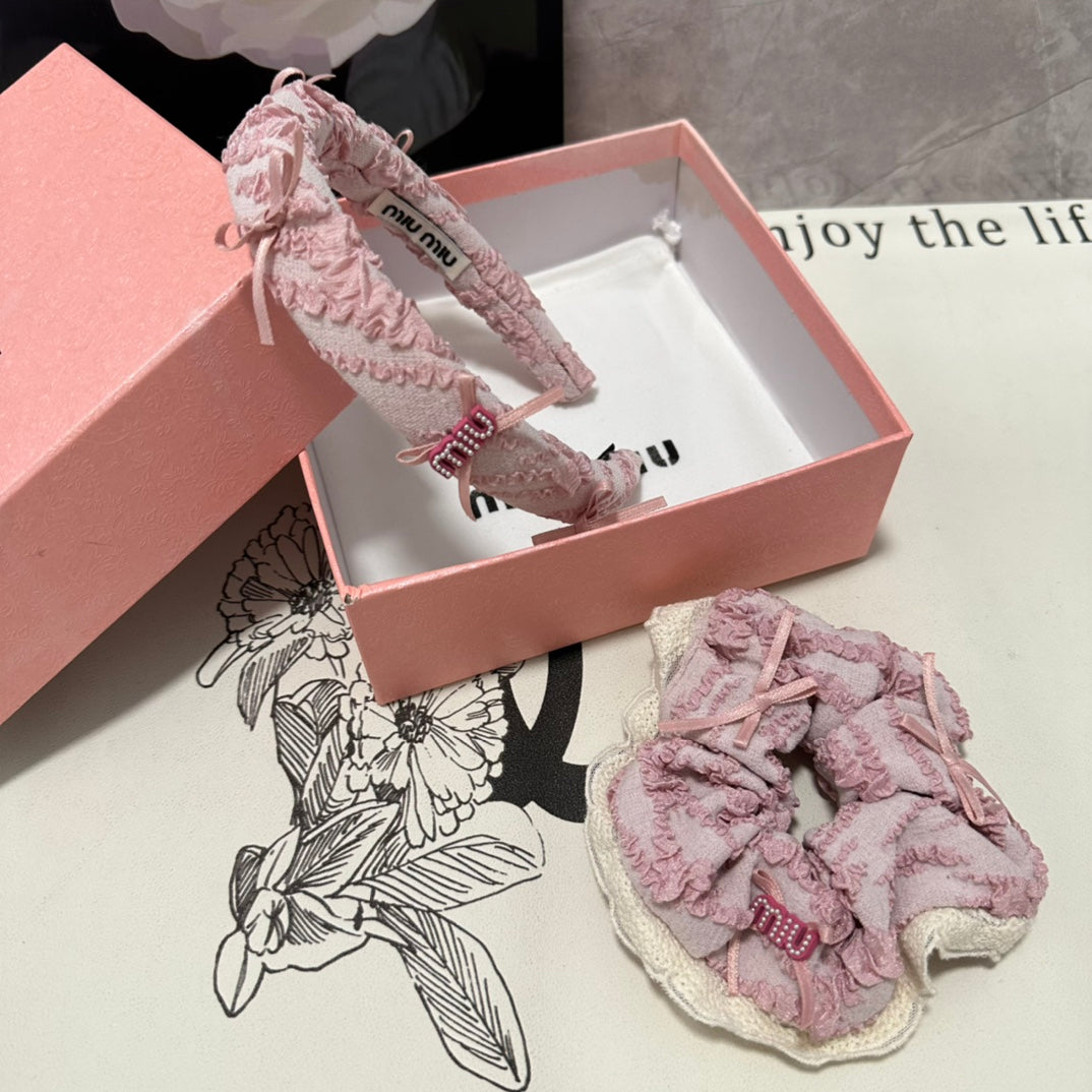 SET HEADBAND AND HAIR TIE IN LIGHT PINK FABRIC ATTACHED BOWS 432848
