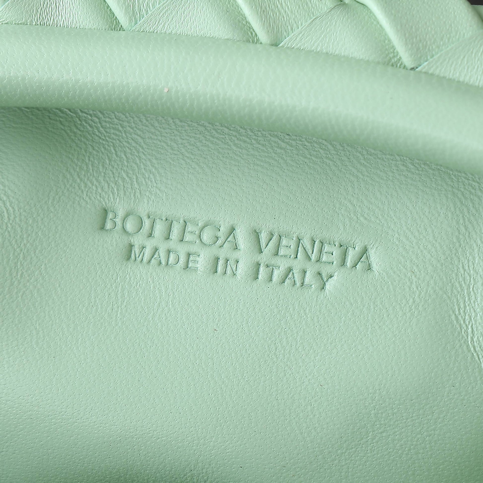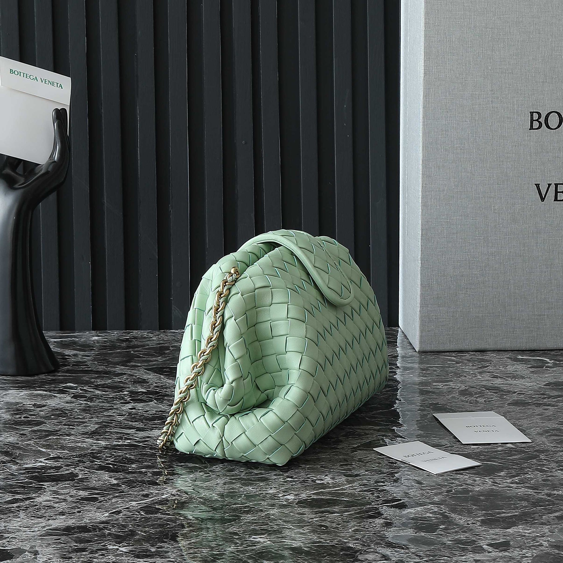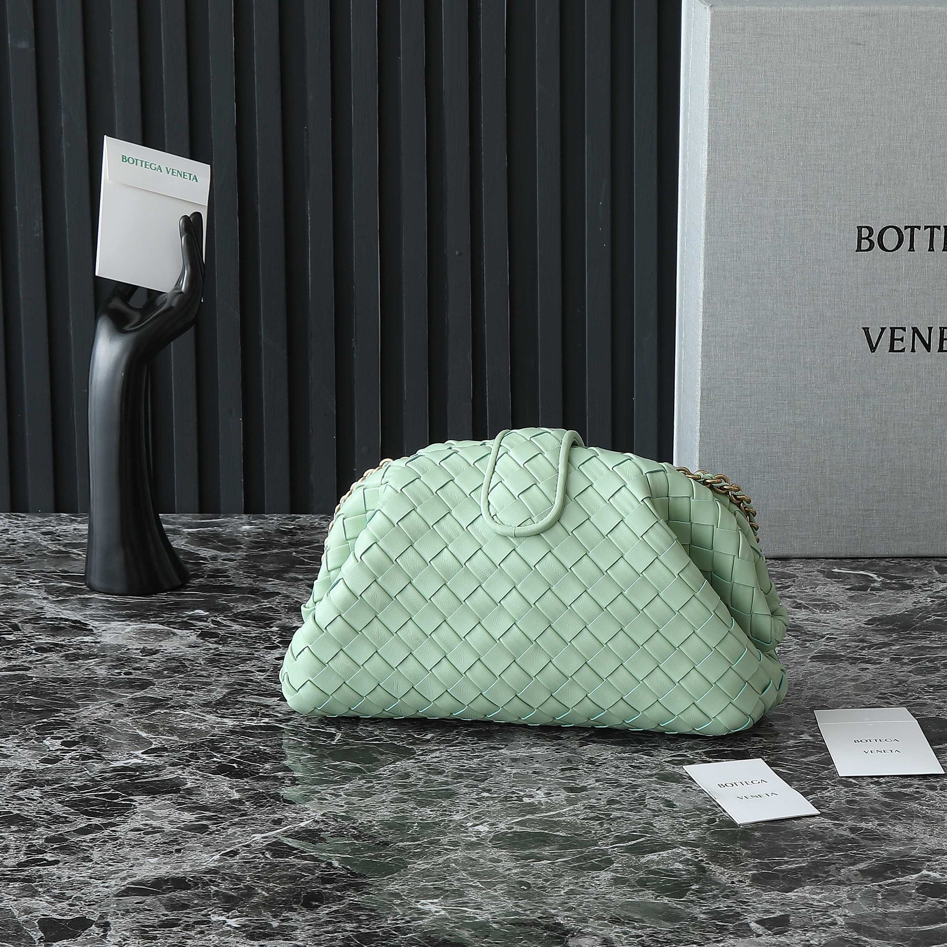 • Padded Intrecciato leather teen clutch with leather braided metal chain
