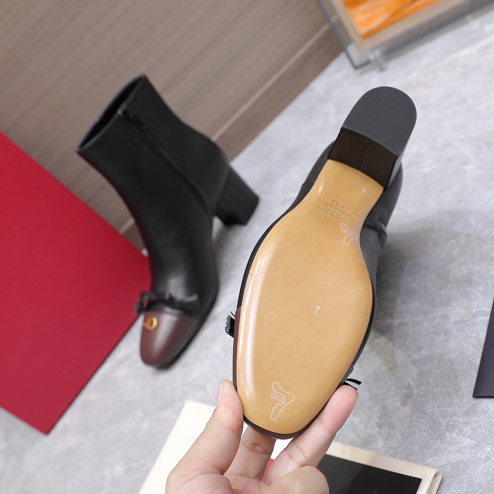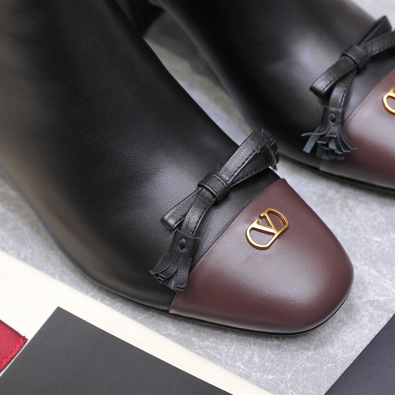 VALENTINO 25S VALET DU ROI ANKLE BOOTS 60 MM IN BLACK MIX DARK BROWN CALFSKIN WITH BOW